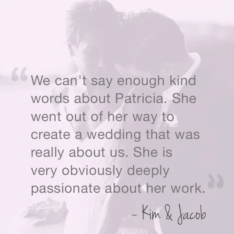 “We can’t say enough kind words about Patricia. She went out of her way to create a wedding that was really about us. She is very obviously deeply passionate about her work.”