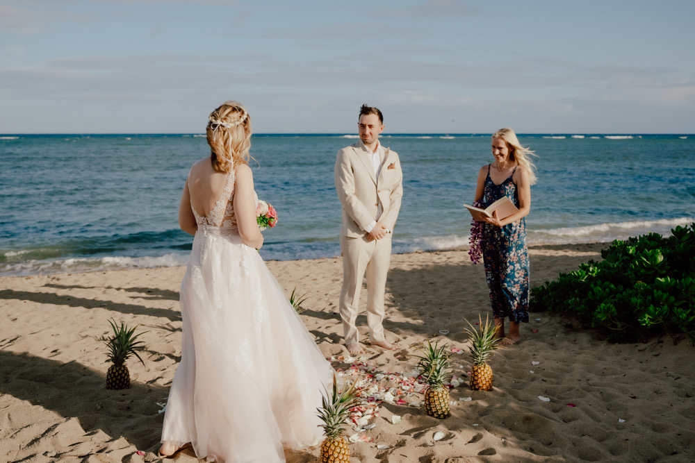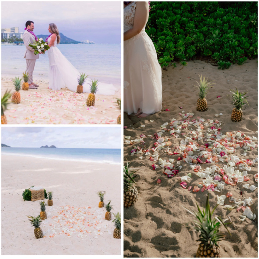 Links und rechts jeweils 3 Ananas und in der Mitte hunderte Blütenblätter. Die perfekte Dekoration für Eure Hawaii-Hochzeit.