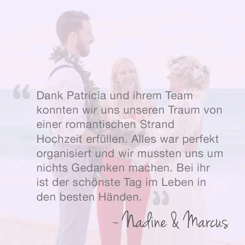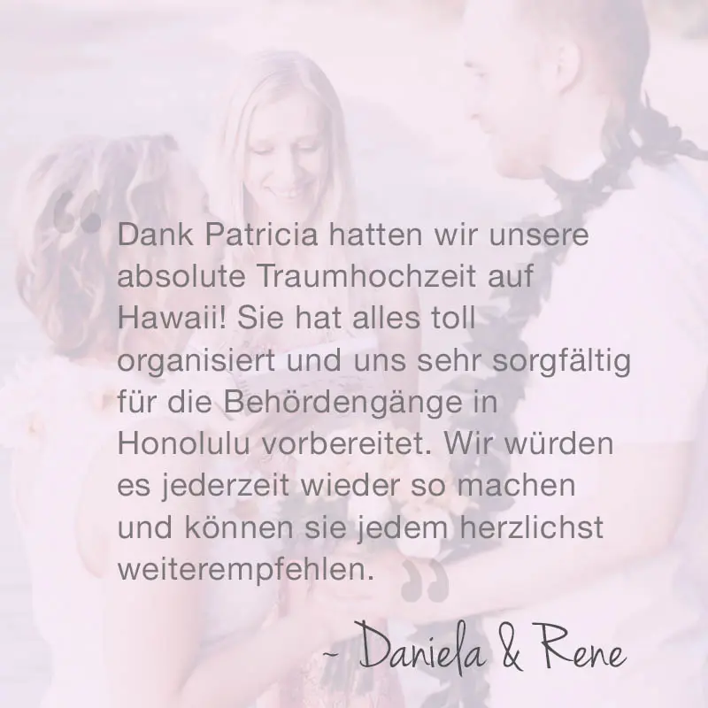 “Dank Patricia hatten wir unsere absolute Traumhochzeit auf Hawaii! Sie hat alles toll organisiert und uns sehr sorgfältig für die Behördengänge in Honolulu vorbereitet. Wir würden es jederzeit wieder so machen und können sie jedem herzlichst weiterempfehlen.”